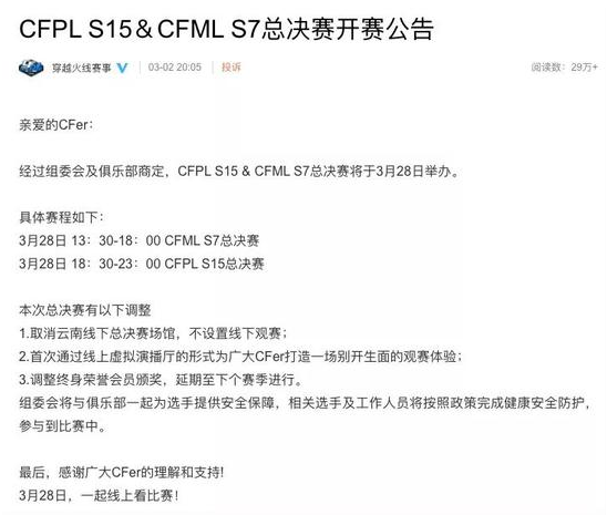 按照最初的計劃,CFPL S15 & CFML S7總決賽本該在2月份揭幕,但由于特殊時期做出了延后調(diào)整。