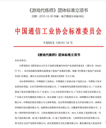 2020年4月3日,中標(biāo)委(中國(guó)國(guó)家標(biāo)準(zhǔn)化管理委員會(huì))發(fā)布了一份名為《電子競(jìng)技游戲代練師標(biāo)準(zhǔn)》的公告,這意味著今后游戲愛好者可以通過認(rèn)定平臺(tái)進(jìn)行考核,合格者將被授予“游戲代練師”官方職業(yè)技能認(rèn)定。