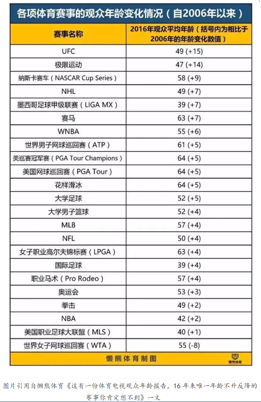 圖片引用自懶熊體育《這有一份體育電視觀眾年齡報(bào)告,16年來(lái)唯一年齡不升反降的賽事你肯定想不到》一文