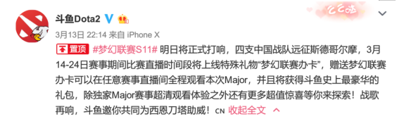 昨晚,斗魚(yú)在微博上宣布,玩家們需要贈(zèng)送“夢(mèng)幻聯(lián)賽辦卡”(也就是需要付費(fèi),6 元人民幣),才能完整地觀看本次Major 全程的比賽。除了觀賽以外,玩家們還能獲得相應(yīng)的禮包。