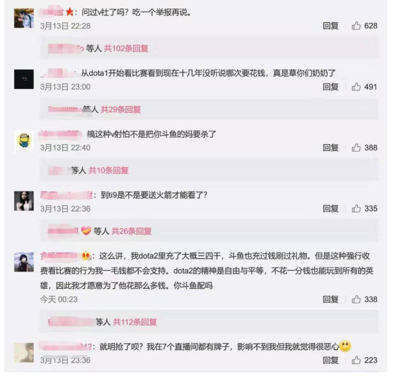 但付費(fèi)觀賽畢竟是大跨步,如果拿《英雄聯(lián)盟》《王者榮耀》這種觀賽人數(shù)更多的聯(lián)賽動(dòng)手,負(fù)面影響和風(fēng)險(xiǎn)勢(shì)必會(huì)更大,而國(guó)內(nèi)《DotA 2》圈子相對(duì)較小,且玩家付費(fèi)能力更強(qiáng),所以《DotA 2》成了一片“試驗(yàn)田”。只不過(guò),斗魚(yú)低估了玩家們的抵觸情緒。