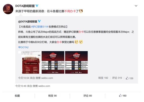 其次,和NBA、英超這種成熟聯(lián)賽不同,平臺(tái)方與游戲公司之前還沒(méi)有完整的鏈條,目前的版權(quán)費(fèi)還是一錘子買(mǎi)賣(mài),玩家在《DotA 2》客戶端中就能免費(fèi)觀賽,還能自由選擇視角,微博評(píng)論中就玩家表示“我就是付費(fèi),也是給V 社付”。如此背景下,斗魚(yú)的強(qiáng)制付費(fèi),難免會(huì)引起玩家的抵制。