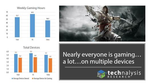 本次調(diào)查方式是對(duì)2022名每周在數(shù)碼設(shè)備上游戲超過(guò)2小時(shí)的玩家進(jìn)行在線問(wèn)卷調(diào)查,其中1011名為美國(guó)人,1011名為中國(guó)人。如果將這些觀看時(shí)間納入到游戲時(shí)間的話,美國(guó)玩家平均每周的游戲時(shí)間為65個(gè)小時(shí),而中國(guó)玩家為47個(gè)小時(shí)。需要明確的是以上游戲時(shí)間是受調(diào)查的參與者自行報(bào)告的,并使用了一系列檢查進(jìn)行了一些調(diào)整,但是這個(gè)數(shù)據(jù)依然太高了。不管真實(shí)的數(shù)據(jù)如何,很明顯游戲和游戲相關(guān)的活動(dòng)占用了很多人的非睡眠時(shí)間。