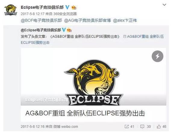 2017年BOF戰(zhàn)隊(duì)與AG戰(zhàn)隊(duì)合作,重組后改名Eclipse戰(zhàn)隊(duì)2017年,鑒于成績才是戰(zhàn)隊(duì)經(jīng)營的根本,Alex決定放下收入不菲的直播工作,將所有精力放在俱樂部經(jīng)營和對選手的督促上。很快,Eclipse在Alex接手后的第一個(gè)比賽里就贏了Tyloo。