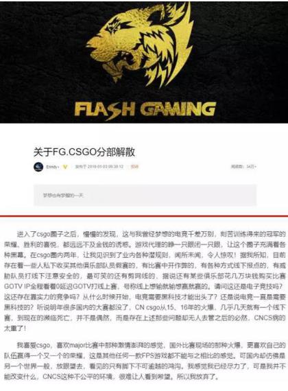 剛剛解散的FG戰(zhàn)隊(duì)老板發(fā)布長文,揭露了國內(nèi)CS:GO圈的部分亂象“前兩年很多圈內(nèi)人都對這個(gè)游戲滿懷熱情和信心,現(xiàn)在他們中有些連提都不愿意再提,誰也無法憑一己之力扭轉(zhuǎn)乾坤?!币晃徊辉竿嘎缎彰娜锶烁锌?。