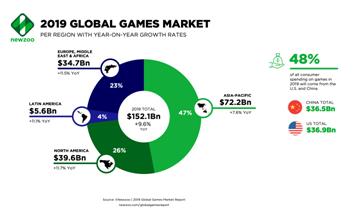 這份報(bào)告同時(shí)顯示,中美兩國(guó)2019年游戲收入占總?cè)蚴袌?chǎng)比例為48%。