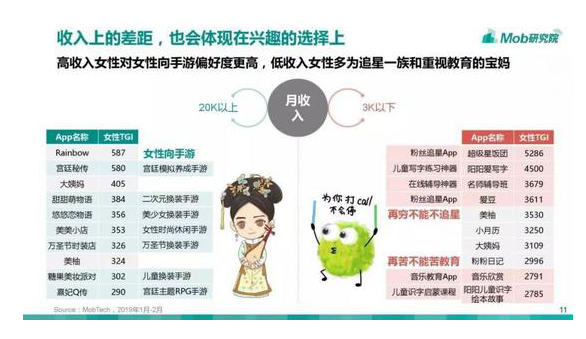 此外,去年Mobdata發(fā)布的《2019“她經(jīng)濟(jì)”研究報(bào)告》中也明確指出,月收入20K以上的高收入女性對(duì)手游的偏好度更好,宮廷模擬養(yǎng)成、二次元換裝、美少女換裝三類題材的女性向產(chǎn)品分列TGI前三席——得益于高收入女性的普遍青睞,女性向手游顯然有著廣闊的“錢(qián)景”。