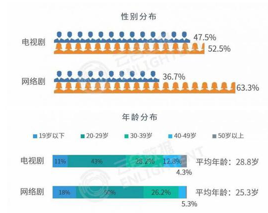 云合數(shù)據(jù)年初發(fā)布的影視劇行業(yè)報(bào)告《2019全年連續(xù)劇網(wǎng)播表現(xiàn)及用戶分析》中指出,2019年上新連續(xù)劇女性占比為52.5%,平均年齡為28.8歲;其中,網(wǎng)絡(luò)劇用戶呈現(xiàn)更加女性化、年輕化特點(diǎn),網(wǎng)絡(luò)劇女性占比63.3%,平均年齡為25.3歲。