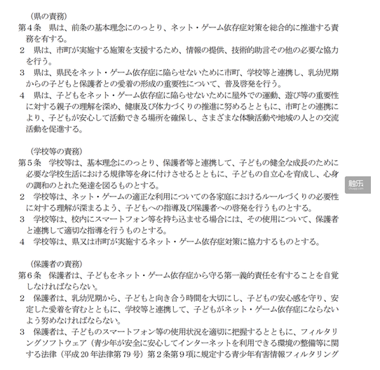 從內(nèi)容中可以看出,香川縣議會在《條例》中體現(xiàn)的重點之一,是劃分政府、學校、監(jiān)護人、游戲廠商、電信運營商、相關(guān)行業(yè)從業(yè)者的責任。