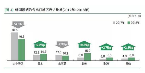 具體目的地層面,截至2018年,盡管由于中國游戲市場本土發(fā)展迅猛,和韓國游戲未能獲得版號、后繼乏力等原因,韓國游戲出口目的地所占比重,中國從60.5%下滑到了46.5%,跌破五成。畢竟不是所有產(chǎn)品都是《穿越火線》《DNF》,所有IP都是傳奇。不過盡管如此,中國依然是韓國游戲第一大出口地。