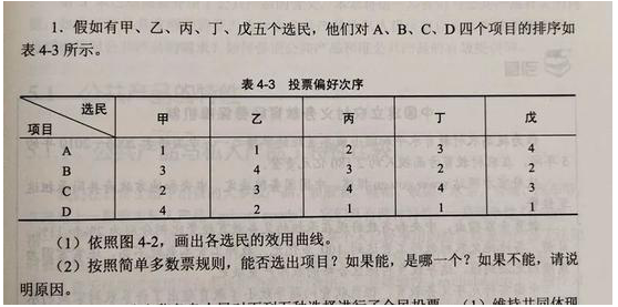 要指出的是,多峰偏好是產(chǎn)生投票悖論的必要條件,而不是充分條件,出現(xiàn)投票悖論必然存在多峰偏好,但反之則不然。下面有道題就是這種情況,有興趣的可以去解一下。