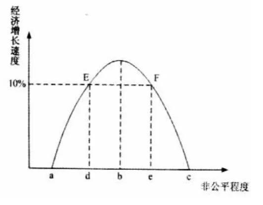 根據(jù)這一簡單模型我們可以看出,首先無論經(jīng)濟(jì)在什么階段, 經(jīng)濟(jì)增長總會帶來一定的不均衡;其次,二者的替代關(guān)系是非線性的,同樣的經(jīng)濟(jì)增長速度可以對應(yīng)兩種不同的不均衡程度。如不均衡在d和e點都可以實現(xiàn)10%的增長,但在d點顯然要比e點更好,能夠在較低的不均衡狀態(tài)下實現(xiàn)較高幅度的增長,那么我們顯然可以在較低的不均衡下實現(xiàn)較高幅度的增長 ,而不是單純追求經(jīng)濟(jì)增長率。