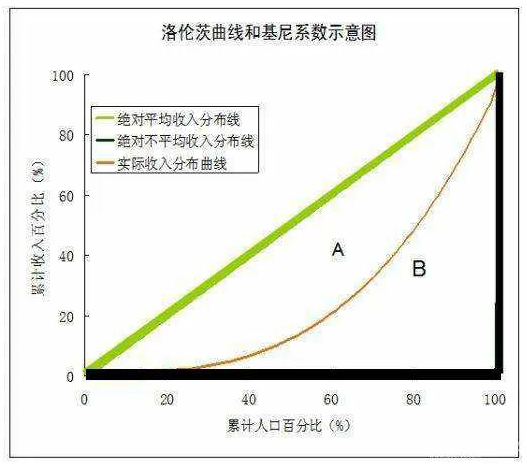 如上圖所示對角線為收入絕對平等線,即每個人都等到等同的收入,直角折線代表絕對不平等線,即一個人得到了全部收入(劉慈欣《贍養(yǎng)人類》)。一般情形為那條凸向橫軸的曲線,而其包圍的圖形A面積與圖形A+B的比值就是基尼系數(shù),基尼系數(shù)介于0到1之間,越小就越平等。