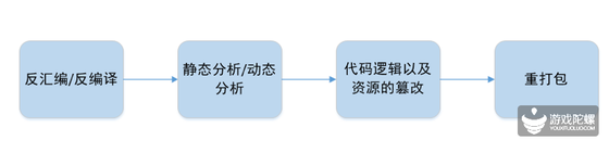攻擊者通過(guò)去反編譯分析游戲中的核心文件,比如代碼邏輯或者是資源文件。典型的就是通過(guò)U3D mono中的dll文件,找到對(duì)應(yīng)的游戲邏輯進(jìn)行篡改,達(dá)到自己的破解目的,或者去分析il2cpp中的libil2cpp.so文件,分析其中的關(guān)鍵游戲邏輯進(jìn)行篡改,進(jìn)而進(jìn)行二次打包(如下圖2-1所示)。面對(duì)這些破解手段,重要文件的各種加固加殼的保護(hù)應(yīng)運(yùn)而生,進(jìn)而阻擋攻擊者的分析。