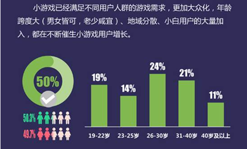 基于小游戲即點即玩、可社交傳播、碎片化時間和輕松休閑樂趣特點,小游戲的玩家群體已形成年齡跨度大、男女比例均衡、地域分布廣的特點,主要由分布在三線城市媽媽、學生、老人群體組成。根據(jù)白皮書統(tǒng)計數(shù)據(jù)顯示,在性別構成上,男女用戶比例持平達到1:1。其中在年齡層方面,26-30歲用戶和31-40歲用戶擔當主力,分別占24%和21%;19-22歲和23-25歲的用戶則占19%與14%;而40歲及以上用戶也占11%,成為重要組成群體之一。