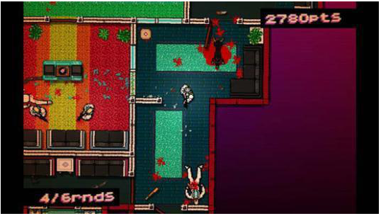 而邁阿密就很有趣,雖然你依舊要重新開始,但是因為點擊就可以很快速地重新開始,重新開始之后任何一次成功的擊殺,都會使血液飛濺,特效蹦出,營造視覺刺激。使我們很難真的冷卻下來。