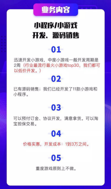 一則頗具爭議的克隆微信小游戲的價目表正在圈子里流傳?!皩W⒖寺。蛔鰟?chuàng)新;不搞定制。”如此直接的廣告語一下子引發(fā)了小程序開發(fā)者群里不少用戶的憤怒,某公司的游戲研發(fā)者直接痛斥說“現(xiàn)在最高調(diào)的就是抄襲?!?