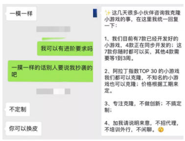 36氪根據(jù)廣告中張貼的二維碼,聯(lián)系到微信名為“飛”的銷售,連招呼都還沒打,對方就發(fā)來一條設(shè)置好的微信,“阿拉丁指數(shù)TOP 30 的小游戲我們都可以克隆,不知名的小游戲也可以克隆;價格根據(jù)工期來定。已經(jīng)開發(fā)好的游戲可以直接付款買走,正在開發(fā)的幾款大約需要等1-2周?!?