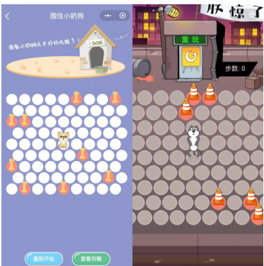 以《圍住小奶狗》和《圍住震驚狗》為例。兩款小游戲的頭像畫風(fēng)不同,一只是卡通狗,一只是暴漫狗,但主題、玩法極度相似,道具略有差別,從肉骨頭到路障,利用道具圍住狗,開發(fā)主體分屬連云港和上海的兩家不同公司。