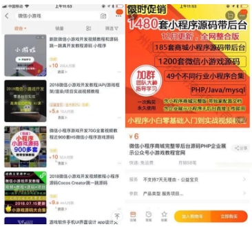 小游戲的輕量化,使得復(fù)制成本也很低。淘寶上,成千上百套小游戲源代碼打包出售的價格為6元到10元,拍下自動發(fā)貨。