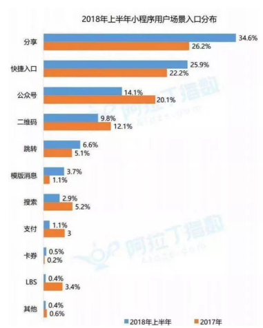根據(jù)阿拉丁“2018年上半年小程序生態(tài)白皮書”的數(shù)據(jù)來看,“分享”以34.6%,位列用戶場景入口的第一位,較2017年增長8.4%,也已大比例超過“快捷入口”的25.9% 和“公眾號”的14.1%。