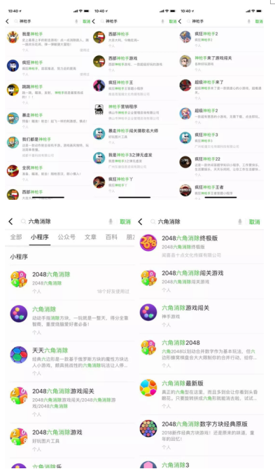 但當(dāng)記者在微信搜索欄中輸入兩款熱門游戲的關(guān)鍵詞時,同類游戲多到一時竟加載不完。