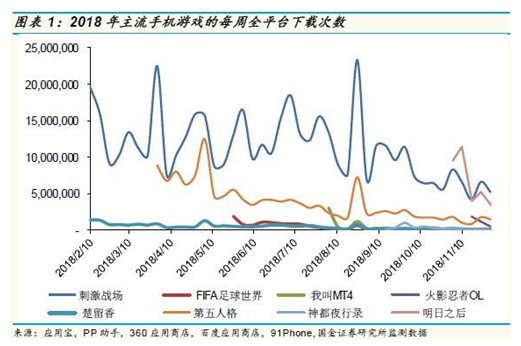 2018年,中國(guó)游戲行業(yè)的主題詞是“吃雞”。網(wǎng)易的《荒野行動(dòng)》《終結(jié)者2》在“吃雞”游戲流行的早期曾經(jīng)獲得先發(fā)優(yōu)勢(shì),但是騰訊的《絕地求生之刺激戰(zhàn)場(chǎng)》很快奪走了優(yōu)勢(shì),引發(fā)了絲毫不遜于當(dāng)年《王者榮耀》的全民風(fēng)暴。根據(jù)我們對(duì)主流應(yīng)用市場(chǎng)的統(tǒng)計(jì),自從2月初公測(cè)以來(lái),《刺激戰(zhàn)場(chǎng)》每一周的全渠道下載量都超過(guò)500萬(wàn)次,甚至一度突破2000萬(wàn)次。我們估計(jì),《刺激戰(zhàn)場(chǎng)》的峰值DAU(日活用戶)達(dá)到了6000萬(wàn)。