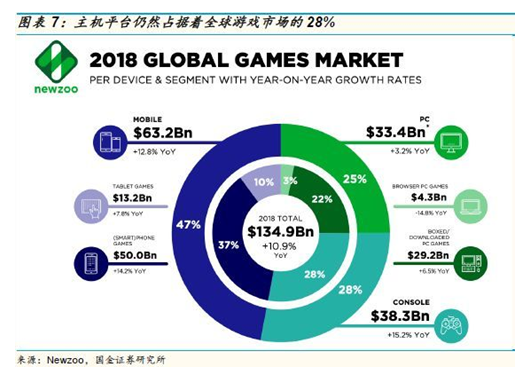 根據(jù)Newzoo統(tǒng)計(jì),2018年,移動(dòng)平臺(tái)(包括智能手機(jī)和平板)占據(jù)了全球游戲市場(chǎng)的47%,主機(jī)平臺(tái)占據(jù)28%,PC平臺(tái)占據(jù)25%;看樣子,在移動(dòng)端玩游戲已經(jīng)成為無(wú)可爭(zhēng)議的主流。然而,這個(gè)數(shù)據(jù)沒(méi)有體現(xiàn)全球各區(qū)域市場(chǎng)的巨大不平衡:移動(dòng)游戲的強(qiáng)勢(shì)地區(qū)是東亞、東南亞以及廣大發(fā)展中國(guó)家;主機(jī)游戲的大本營(yíng)是美國(guó)、歐洲和日本。我們估計(jì),2018年中國(guó)和韓國(guó)的移動(dòng)游戲收入總和就超過(guò)了250億美元,相當(dāng)于全球移動(dòng)游戲收入的40%。在發(fā)達(dá)國(guó)家,主機(jī)游戲仍然擁有舉足輕重的地位。