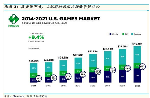以美國(guó)為例,2018年,主機(jī)平臺(tái)占據(jù)了游戲市場(chǎng)的46%,移動(dòng)平臺(tái)只占36%。美國(guó)玩家習(xí)慣于在主機(jī)上玩重度游戲,一線游戲IP幾乎都以主機(jī)為大本營(yíng),動(dòng)視暴雪、EA、UbiSoft等游戲大廠也以主機(jī)平臺(tái)為主要收入來(lái)源。雖然近年來(lái)美國(guó)移動(dòng)游戲市場(chǎng)也在發(fā)展壯大,但是并沒(méi)有威脅到主機(jī)的統(tǒng)治地位,反而是PC平臺(tái)逐漸被邊緣化。在移動(dòng)端,最流行的是SLG、RTS、休閑等不適合主機(jī)端的游戲,兩者形成了互補(bǔ)關(guān)系。