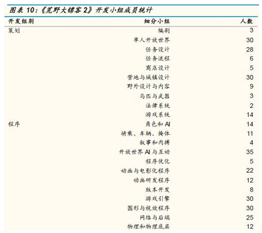 更令人恐懼的是,《荒野大鏢客2》的開(kāi)發(fā)團(tuán)隊(duì)非常復(fù)雜:馬匹、武器和車(chē)輛都有專門(mén)的策劃、程序和美術(shù)人員;游戲內(nèi)的法律系統(tǒng)有專人設(shè)計(jì);城鎮(zhèn)、營(yíng)地和水體都采用了單獨(dú)的美術(shù)團(tuán)隊(duì)……如此繁復(fù)的分工,為人才培養(yǎng)和儲(chǔ)備提出了很高的要求,也大幅增加了管理成本。而且,這款游戲的開(kāi)發(fā)周期長(zhǎng)達(dá)4年,這意味著項(xiàng)目組也要存續(xù)4年!現(xiàn)代游戲產(chǎn)品對(duì)人力、組織力的要求之高,已經(jīng)遠(yuǎn)遠(yuǎn)超過(guò)一般人的想象。