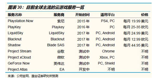 目前,全世界已經(jīng)有10-20個(gè)商業(yè)化的云游戲服務(wù),其中最成功的是索尼的Playstation Now。微軟、谷歌、英偉達(dá)、EA都在測(cè)試或開(kāi)發(fā)自己的云游戲服務(wù)。由于各大平臺(tái)的市場(chǎng)策略和授權(quán)問(wèn)題,現(xiàn)在尚未出現(xiàn)跨越所有主流平臺(tái)的云游戲解決方案,但是PS4、PC和移動(dòng)端都有自己的云游戲服務(wù)。微軟的Project xCloud雖然尚未發(fā)布,但是已經(jīng)公開(kāi)了自己的野心:構(gòu)建全平臺(tái)、全地域、全用戶的云游戲生態(tài)圈。