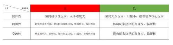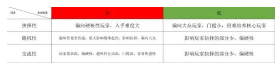 桌面卡牌類游戲通常伴隨著以上三個性質(zhì)來進行設置,圍繞著不同程度給玩家不一樣的游戲體驗感,通過分析以上三種性質(zhì)可以總結出該游戲?qū)τ脩舻闹艺\度,上手難度以及游戲體驗感,更好的幫助我們設計分析游戲。