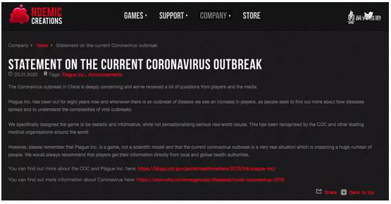 在公示中,官方這樣說(shuō)道:“不管怎么樣,請(qǐng)記住,《瘟疫公司》只是一個(gè)游戲,而不是一個(gè)科學(xué)模型。目前新冠狀病毒感染的肺炎疫情是真實(shí)存在的,它已經(jīng)影響了很多人,而我們需要做的是提醒我們的玩家直接從地區(qū)和全球性的官方權(quán)威組織那里獲取資訊。”