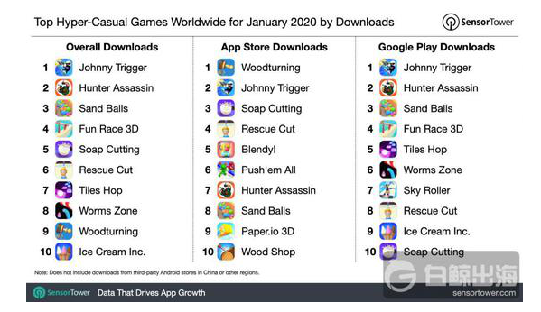正如 Voodoo 所說,成功的超休閑游戲的關(guān)鍵在于簡單且令人滿意。而游戲的成功雖然不可復(fù)制,卻可借鑒。本文將以“2020 年 1 月全球下載 Top10 超休閑游戲榜單”(以下簡稱下載榜單)為例,探究最佳超休閑游戲機(jī)制。